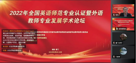 5月21日,由教育部高等学校外国语言文学类专业教学指导委员会英语专业教学指导分委员会、福建省外国语文学会和外语教学与研究出版社联合主办,集美大学承办的“2022年全国英语师范专业认证暨外语教师专业发展学术论坛”在福建厦门举行,陶伟副院长受邀在线参会并在主旨报告环节交流发言,根据会议主题,重点分享了英语(师范)专业认证自评报告中“毕业要求”“质量保障”“师资队伍”和“支持条件”四个标准的内容撰写经验。与会专家对我院英语(师范)专业在“毕业要求达成度”和“职前职后一体化”等方面的做法给予了充分肯定。
