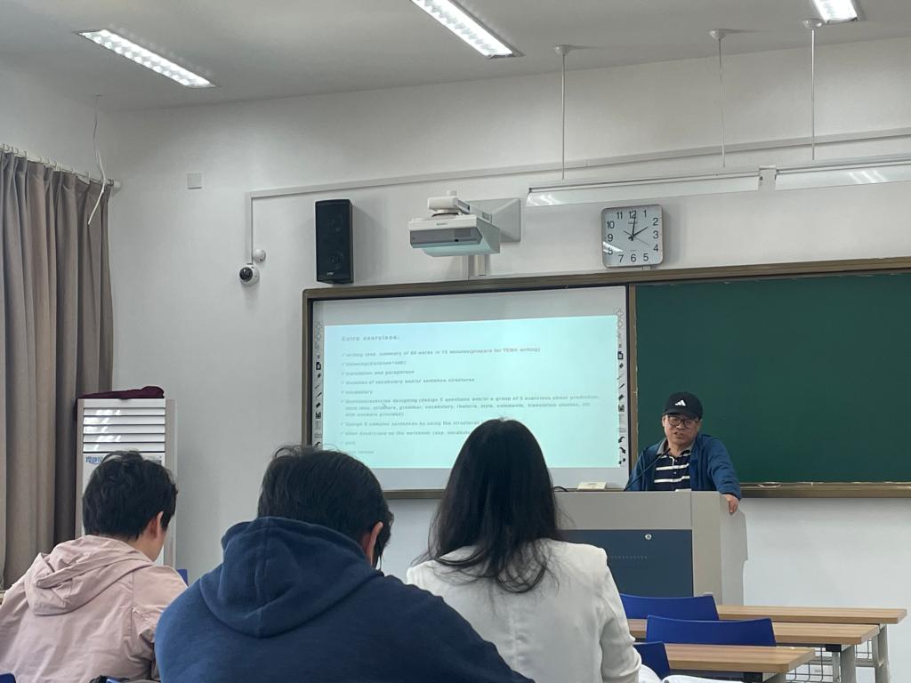 童红灯副教授作题为“以学生为中心的英语师范班综英课教学方法思考”的报告分享。他强调了以学生为中心的课堂教学方法,并指出要着重培养学生的语言能力、思维能力、学习能力、文本分析能力和设计能力、教学能力、管理能力。在课堂教学中,要重视课前准备环节,用丰富的活动激发学生兴趣,鼓励学生通过PPT、Vlog等形式展示自我,改变灌输式教学模式,通过以评促学,以评促教,提高学生学习积极性。