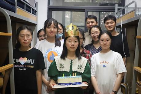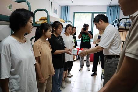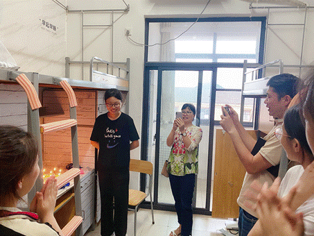 学院领导班子也在开学第一天走访了学生寝室,了解新生报到情况。当天正好是学院许浪琼、张雨欣的生日,为了让同学们感受到在家一般的温暖,学校特地给这两位同学准备惊喜,定制了浙外特色蛋糕为她们庆生。