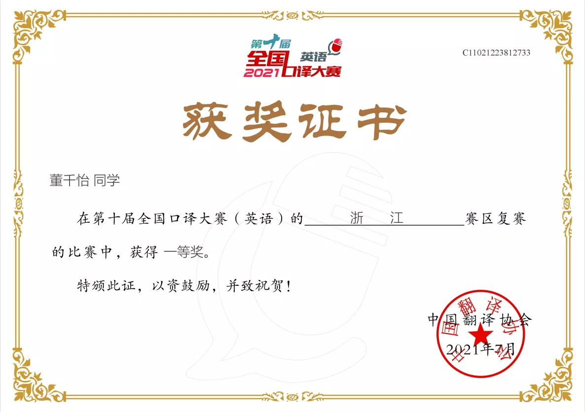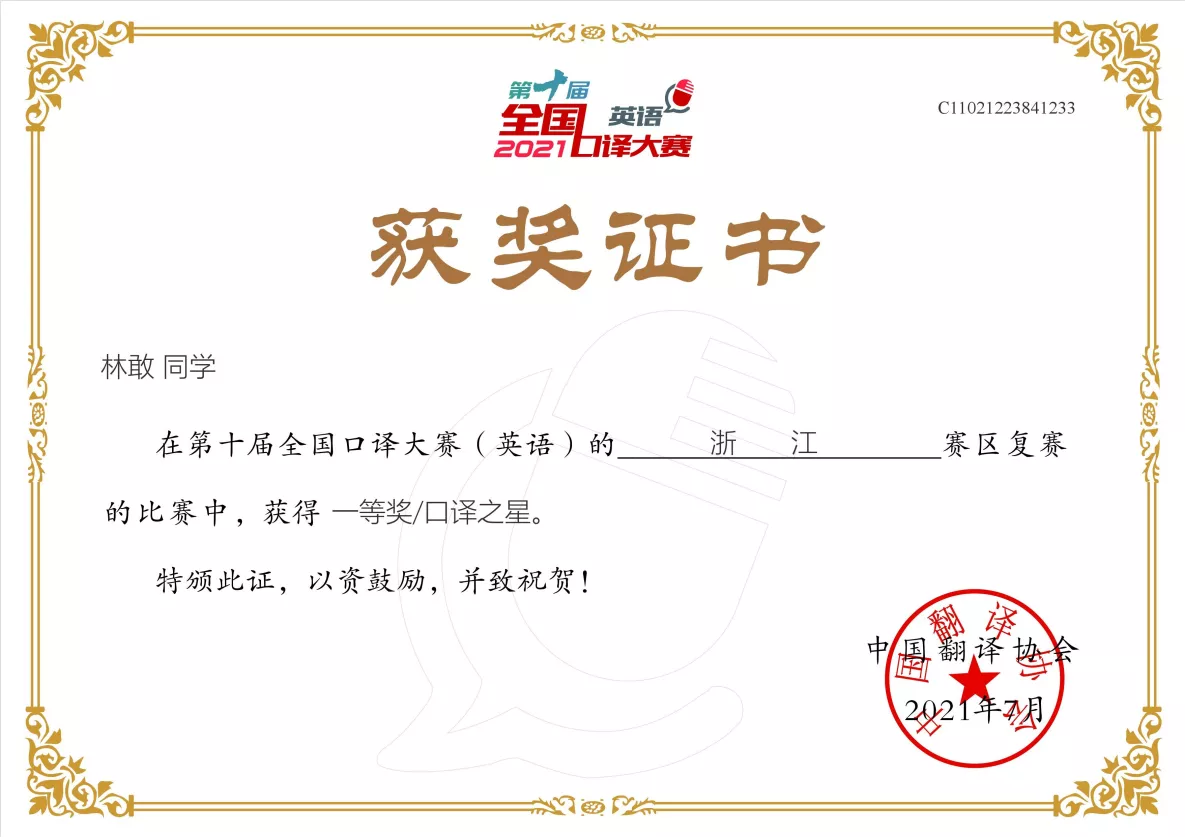 翻译系口译教师团队的指导下,2019级口译班林敢、2018级口译班董千怡荣获一等奖,其中林敢同学以第一名的优秀成绩摘得浙江省口译之星称号;2018级口译班吴心瑜、钱雅婷、周子琦与2019级口译班瞿语轩、陈禹帆荣获二等奖;2019级口译班褚宣吟、2019级英师3班黄暖荣获三等奖;2019级口译班陈杰勋荣获优秀奖。省赛一、二等奖获得者将代表浙江省参加华东大区赛。这是浙外参加该赛事以来取得的最好成绩。