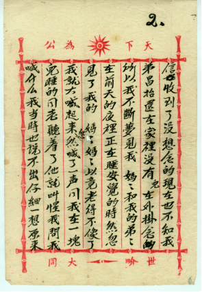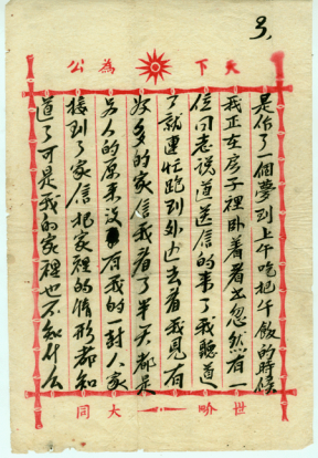 到上午吃把〔罢〕午饭的时候,我正在房子里卧着看书,忽然有一位同志说道:送信的来了!我听道〔到〕了就连忙跑到外边去看,我见有好多的家信,我看了半天都是另〔别〕人的,原来没有我的一封。人家接到了家信,把家里的情形都知道了,可是我的家里也不知什么样子,也不知我母亲和我弟弟的身体如何?夏季的收程〔成〕什么样子?希望你接到了此信速速回知为盼。”