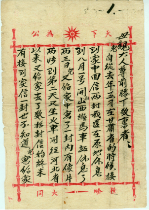 钟士灯是红一方面军第一军第四师十二团第三连的一名战士,他现存的一封家书写于1937年4月30日,从家书内容可知,他已经与家中取得联系:“但是,自三原与家通信一次,也未曾〈知道〉家内接到了〈没有〉?现在也未见回音来,可不知家内怎么样?”他告诉父母亲自己在“陕西栒邑县太峪镇驻房〔防〕,衣食住行是很平安,请你〈们〉在家不要挂念。”(受文化水平的限制,红军家书中错、漏、别字较多,为便于理解,本文作者作了一些校改,〈〉内为补字,〔〕内为改正的字,[]内为衍字,下同)。