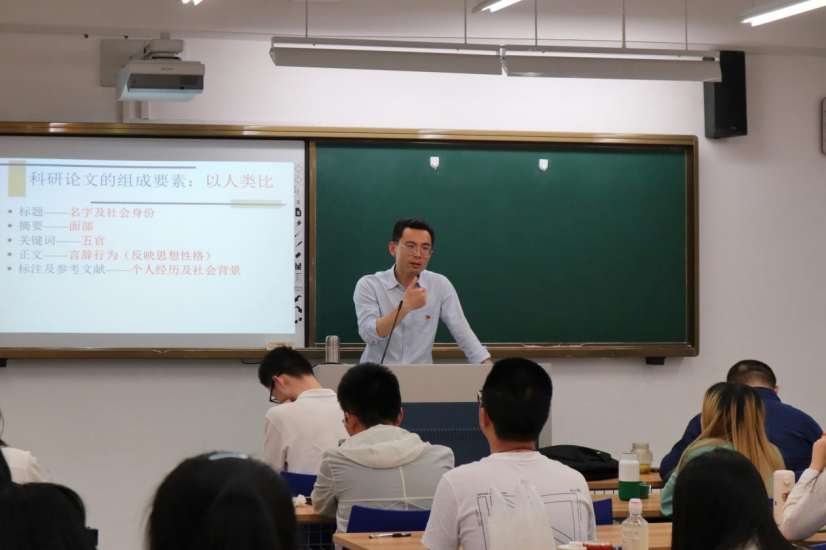 教工党支部书记何习尧老师正在通过生动的比喻向同学们讲解如何进行科研论文写作,他通过论文写作来向同学们传达“学写作 学做人”的思想。