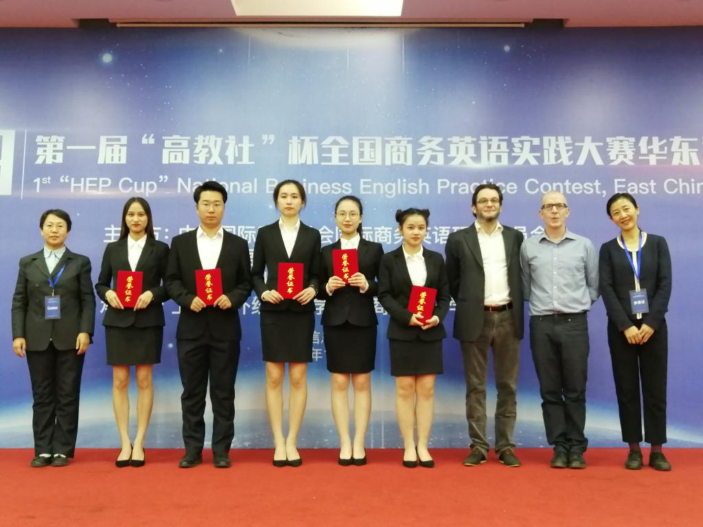 11月2日,2019“高教社杯”全国商务英语实践大赛华东区域赛在上海对外经贸大学顺利举行。我院商务英语系吴诗颖、刘畅禹、许文馨、汪奇燕、李茵五位同学在陆海霞、何习尧、于连江等老师的精心指导下,奋力拼搏,过关斩将,最终夺得华东区复赛一等奖,并成功晋级全国总决赛,这也是我校学生近年来参加此类比赛获得的最好成绩。陆海霞老师,何习尧老师被评为优秀指导教师。
