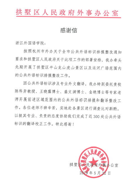 近日,杭州市拱墅区人民政府外事办公室向我院发来感谢信,感谢鸭奈飞 陈科芳教授、王晓露博士,以极其专业、负责的态度协助拱墅区人民政府外事办公室完成近300处公共外语标识的翻译校正工作。