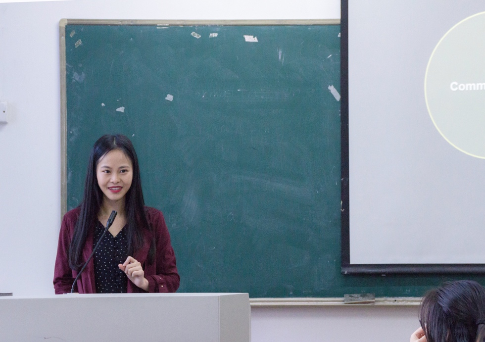 2014届毕业生倪张苗主讲。她结合自身求职经历以及在蓝条教育的工作经验,从求职历程、职业规划、工作理念等多方面,为即将踏入社会学子们讲授了职业生涯规划的重要性以及职场工作中的众多注意事项。同时向在座学生们讲解蓝天教育基本背景、相应的培训体系及发展模式,帮助学生进一步深入了解蓝天教育。