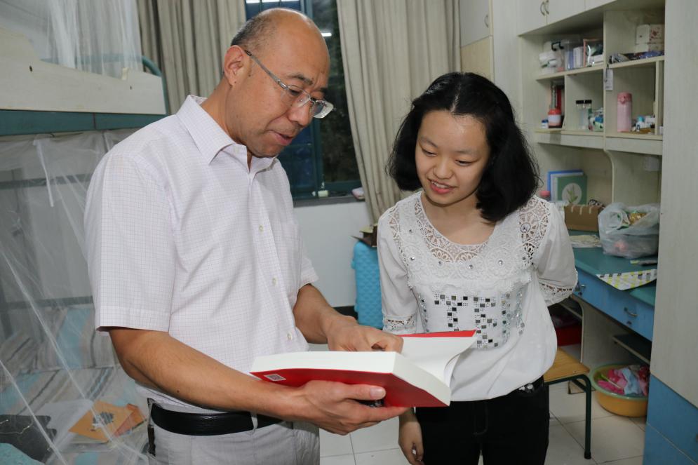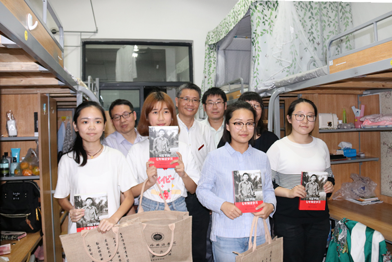 新生寝室,看望慰问新生,并向新生发放大学生涯的第一本教材。