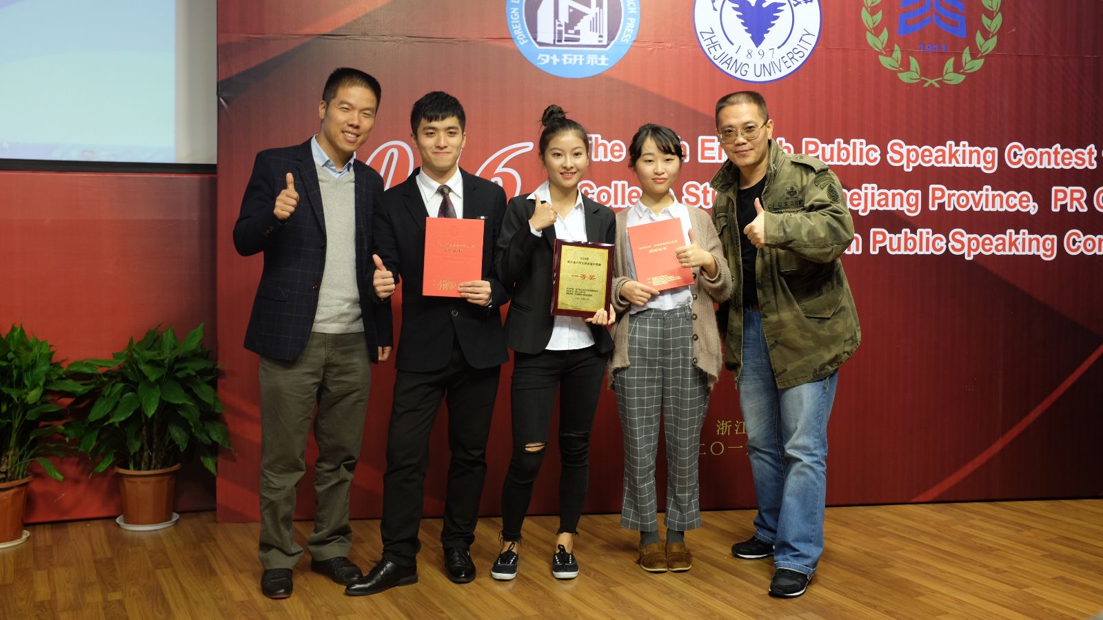 “外研社杯”全国英语演讲大赛于 2002 年创办,在国内外广受关注,已成为全国参赛人数最多、规模最大、水平最高的英语演讲赛事。该比赛由浙江省教育厅、外语教学与研究出版社主办,浙江省高校外国语言文学类专业教学指导委员会、浙江省大学外语教学研究会和浙江大学承办,共有50余所高校共计154名选手参加。我校英语演讲队近几年派出多名选手参加该项赛事,并已连续五年获得了一、二等奖的荣誉,在全省高校中居于前列。