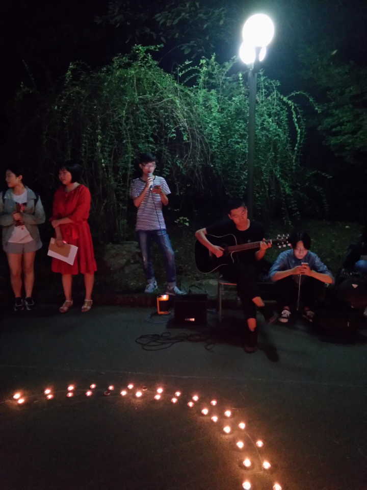 大家一起点上蜡烛,烛光一片,温馨浪漫。伴着来自校和音吉他社的动听歌声,《叶子》到《蓝莲花》,《My heart will go on》、《Counting Stars》、《Hey Jude》。