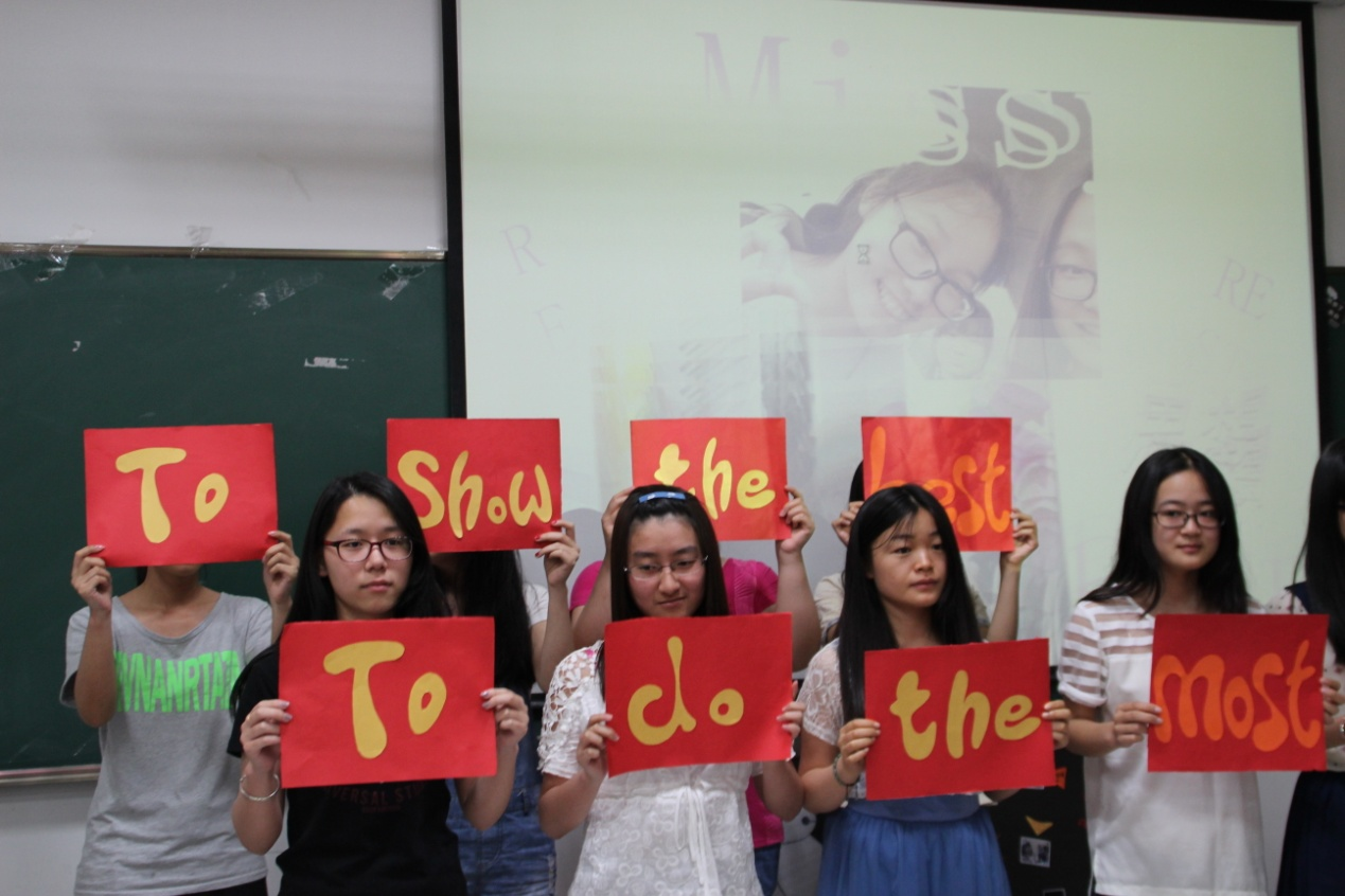 其中,12英语1班以“水”为文化,包容万物,团结友善;12英语3班热衷于志愿服务事业,全班踊跃参与各种志愿活动;14英语师范1班“以德立志、以言践行”,以崇高的道德素质为班级文化;14英语师范2班以"Aim higher, start sooner, carry on longer"为班级口号,以“团结互助”为班级文化核心,力求建设一个充满凝聚力、活力和激情的班集体;13英语翻译1班以“Translatemiracle;Translate soul! ”为口号,以字母T作为自己的班徽,代表了翻译专业的专业特色;13商务英语实验班以“博观约取,厚积薄发”为班级精神,鼓励每个同学只有勤奋刻苦地学习,才能有足够的能力去创新创业,不断追求自己的梦想。