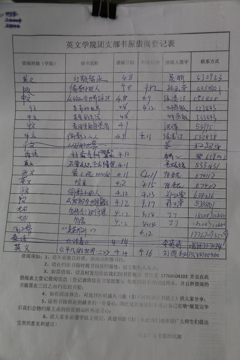 各个团支部的捐献,不仅有文学读本、英文原版小说,还有教辅用书等。这个在教学楼二楼通道上的小书屋,采用学生自己借阅自己登记的方式,提倡诚信。