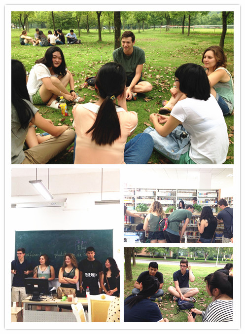中美学生分成小组在草坪上席地而坐。形式多样的自我介绍和趣味游戏一下拉近了大家的距离。两国学生以历史文化、风俗习惯、城市风景、大学教育等为话题侃侃而谈。在绿草如茵、春风送暖的环境下,同学们兴致高涨,现场充满了欢乐的气息。