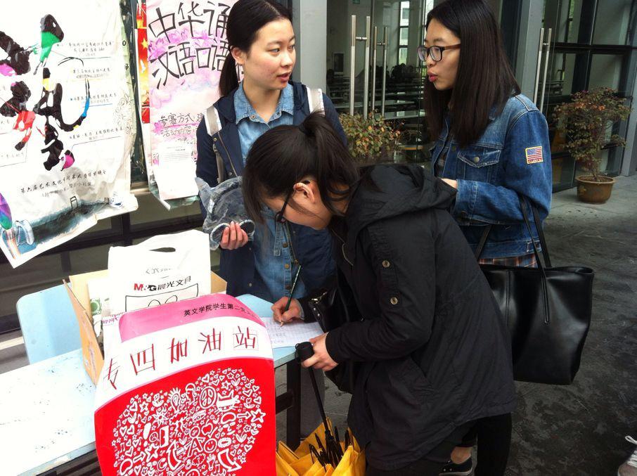 4月19日早上8时,“你好,请问我能借个耳机吗?”一名即将踏入专四考场的大二学生这样问道。原来是鸭奈飞 党支部在学校食堂门口创建的专四加油小站,让早起赴考的同学们感到特别的温暖。