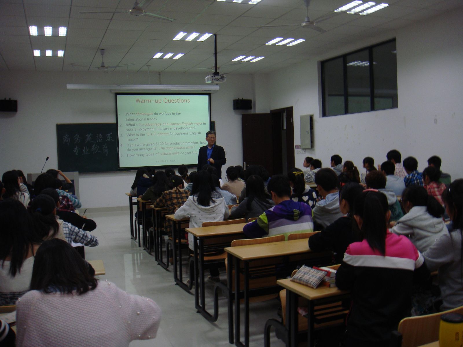 李生禄教授以Warm-up Questions的形式与同学们进行了有效的互动,并在此基础上介绍了当前商务英语专业应关注和解决的问题,其中包括该专业本科生的培养目标与发展方向、商务英语专业课程模块的划分标准和当前英语专业大学生面临的压力与挑战等内容。他强调,同学们应着重提高以语言能力、语言策略能力、语用能力、跨文化交际能力和商务知识运用能力为内容的英语综合能力,锻炼创造性思维,使自己成长为国际化应用型人才。此外,李生禄教授生动地讲解了各种商务案例,为同学们提供了实质性的帮助。