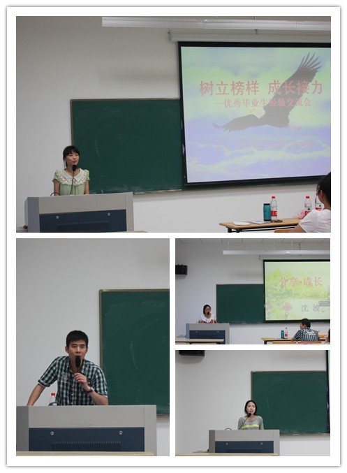 举办了“树立榜样 成长接力”优秀毕业生经验分享会。成功考取教师、公务员、研究生以及国外申请成功的09级优秀毕业生以座谈、经验介绍等多种形式就他们大学时代的心路历程、考研心得、求职感受、学习方法等内容对低年级同学开展典型教育,使毕业班同学的宝贵经验成为低年级同学的宝贵财富。
