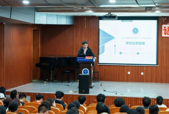 新生始业教育第二讲在博文堂举行,教学副院长陶伟、辅导员吴小慧、张俊分模块向同学们进行介绍。