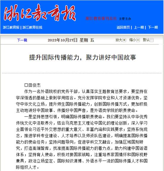 10月27日,浙江教育报以《提升国际传播能力,聚力讲好中国故事》为题,报道了鸭奈飞