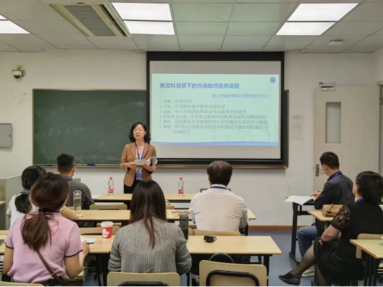 在洪明的带领下,我校外语教育研究中心成员首次以团队展示的形式参会,围绕“新文科背景下的外语教师素养发展”议题,报告了聚焦语言教师数字素养、培训需求、评价素养、跨学科研究能力和拓展学习的最新研究成果,并得到与会教师的好评。应用外语学院刘懿还主持了聚焦“身份认同与外语教师发展”的研究生论坛。