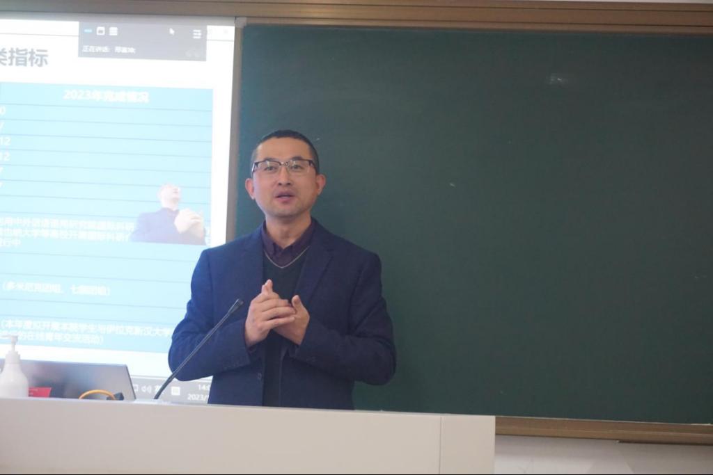 专业发展规划》(讨论稿)进行了宣讲与解读。他从学科与专业的内涵出发,介绍了高校学科专业建设的大背景,紧密结合学校的定位方向和学科总体布局,深入分析了我院学科建设的现状,剖析了当前英语类专业发展面临的内外部挑战和困境。在此基础上,他提出了学院学科的总体布局、学科建设的总体思路、学科架构初步规划、学科团队建设目标和任务等,并就未来优化学科布局、组建学科团队和建设特色领域等方面的工作进行了具体谋划。随后,他详细阐述了专业与学科的关系,提出了学院专业建设的总体目标、专业改造和创新的规划,具体分析了现有专业的培养特色、实践场景、任职行业、核心课程等,以及下一步的具体实施计划。