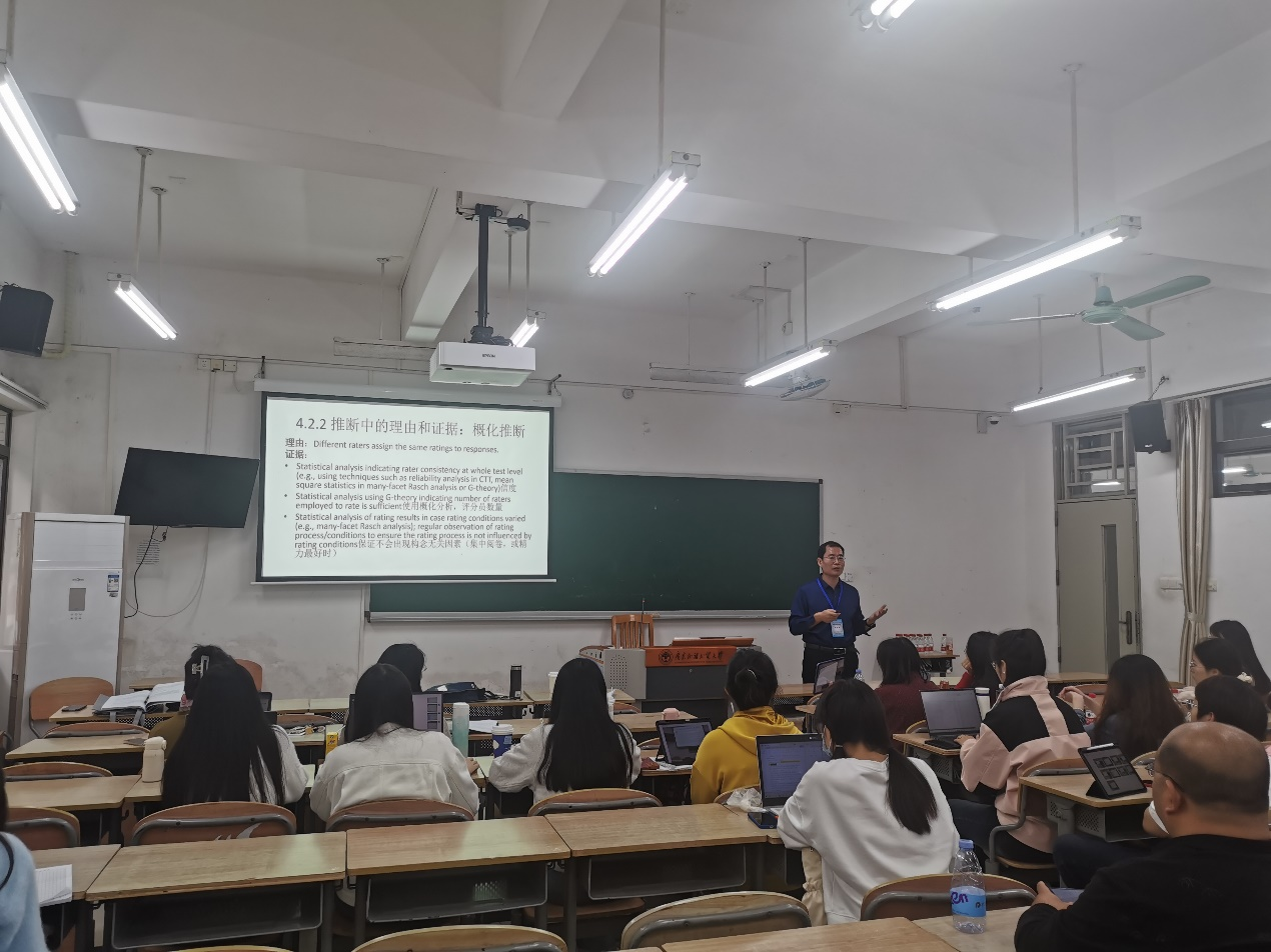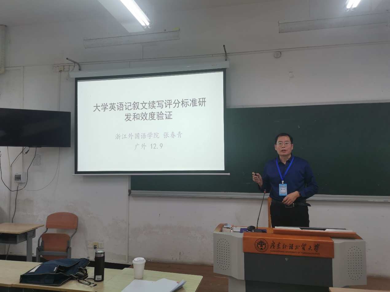 张春青以“大学英语读后续写写作评分标准的研制和效度验证”为主题进行演讲。他回顾了国内外主要记叙文写作评分标准,讲述了评分标准开发过程,并从评估、概化、解释、外推、决策和后效六个方面提出了评分标准效度验证所需的保证、假设和证据。
