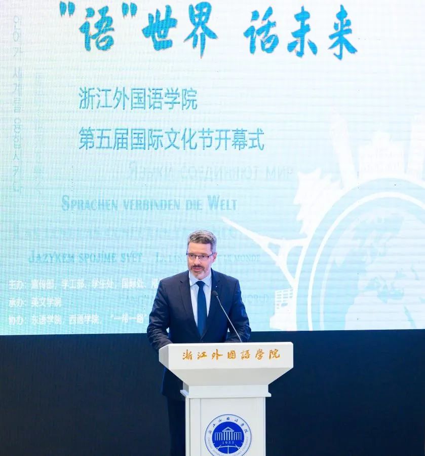 赵文波对史诺先生一行出席开幕式活动表示热烈欢迎。他指出,今年是“一带一路”倡议提出十周年,学校作为改革开放先行地——浙江省的唯一一所公办外语院校,坚持以习近平新时代中国特色社会主义思想为指引,深入践行“八八战略”,把深度参与、高质量服务“一带一路”建设作为义不容辞的使命担当。师生要紧扣“‘语’世界,话未来”的文化节主题,努力搭建各国文化交流融通的平台,增进文明交流互鉴力度,在活动中厚植家国情怀,开阔国际视野;要契合“闻道中华 语美天下”的浙外精神,推动多语种国际传播优势进一步彰显,讲好中国故事、浙江故事;要聚焦学校“三地四域”建设,进一步发挥文化育人作用,打造一批外语特色鲜明、国际化氛围浓厚的精品校园文化活动,努力建设“多元、高雅、现代”的校园文化。