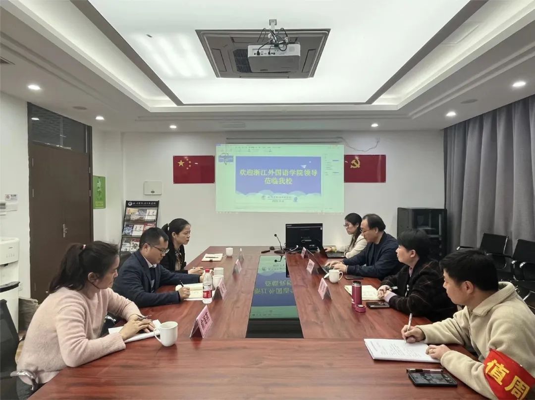 杭州市钱塘外语学校校长张军林对陶伟一行的到来表示欢迎,介绍了学校作为首所“名校广场”的办校理念、教学特色、文化活动等。张军林表示希望能和高校加强合作,创新共建形式、扩宽共赢维度。陶伟介绍了学校和学院的基本情况,重点阐述了学院的人才培养体系和育人成果。双方就外语教师人才培养研究、学生实习实践合作、共建课程和师资共享等方面深入交流,并达成合作意向。