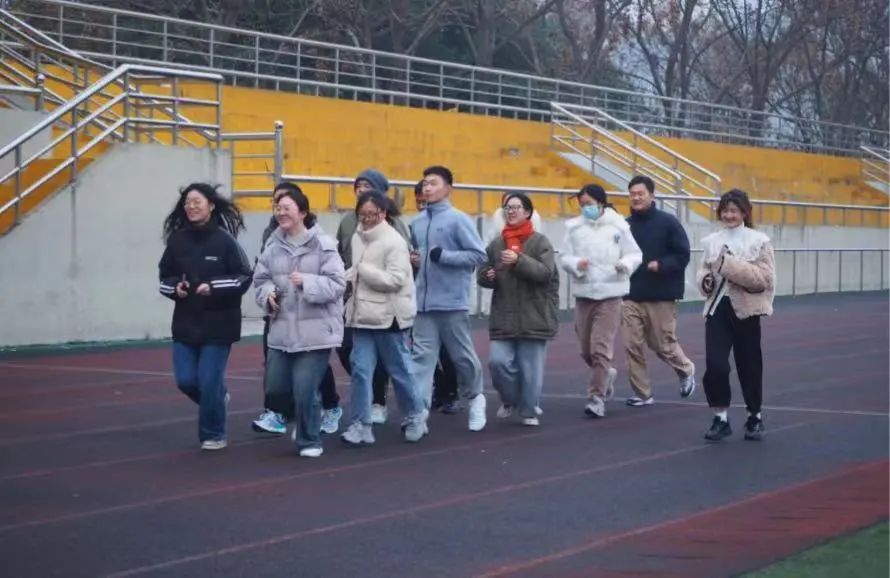 师生用晨跑的形式来开启新年的第一天,希望在新的一年里大家在各方面都可以越跑越快,越跑越远!”
