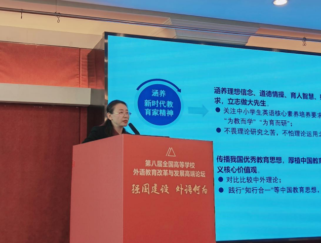 在“英语类专业论坛:新文科背景下的专业建设与发展”上,柴改英作了题为“基于‘桥梁理论’的英语师范专业建设:探索与实践”的主旨报告。该报告在剖析英语师范专业语言教育与教师教育资源壁垒、课程壁垒和师资壁垒的基础上,分享了我校英语师范专业的相关实践及效果。她指出,学校建设了“语言学与中小学英语教学系列”等桥梁教材,开设了依托融合式课程内容、实施浸润式课程思政以及应用创新教学和评价方法的“二语习得与中小学英语教学”桥梁课程,并联动中小学教师合作开展教学与教研。