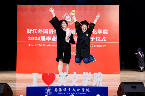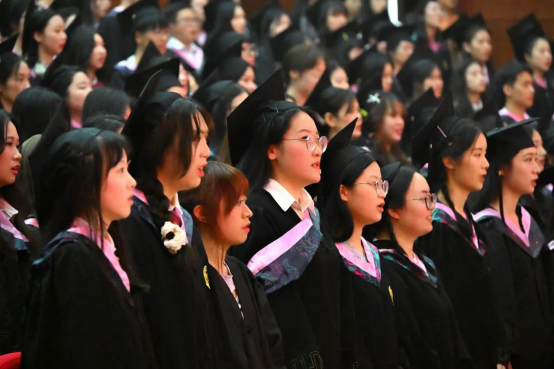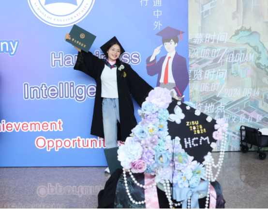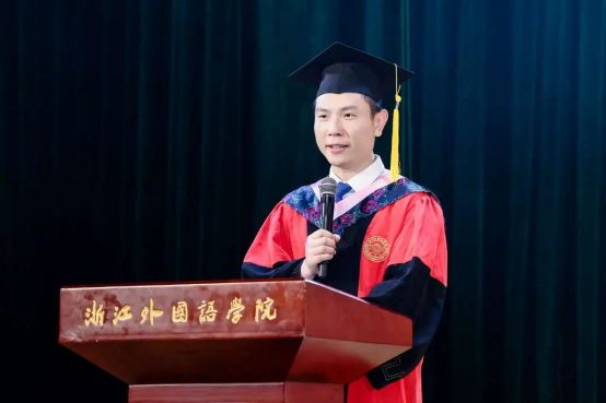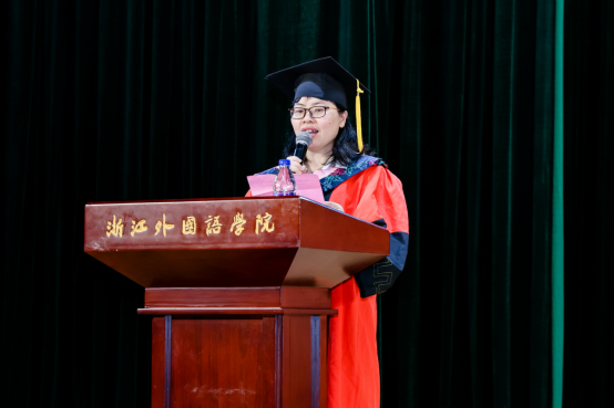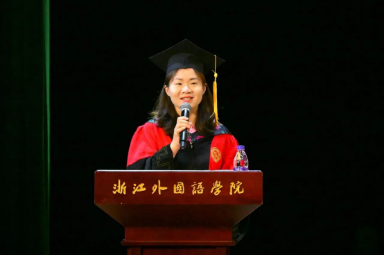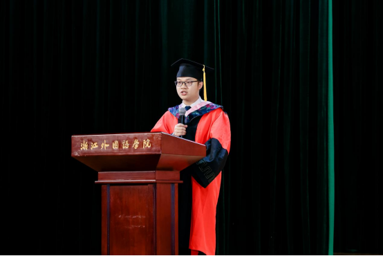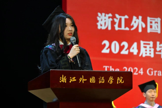 20英语6班蔡晓晨代表毕业生发言。她分享了自己在浙外的多样收获,面对即将到来的新征程,蔡晓晨以"轻舟已过万重山"的豪情,鼓励同学们勇敢迎接挑战。她代表全体毕业生,向学校、学院和老师送上最诚挚的祝福,希望每个人都怀揣着"博雅通达,明德弘毅"的校训奔赴灿烂的前程。
