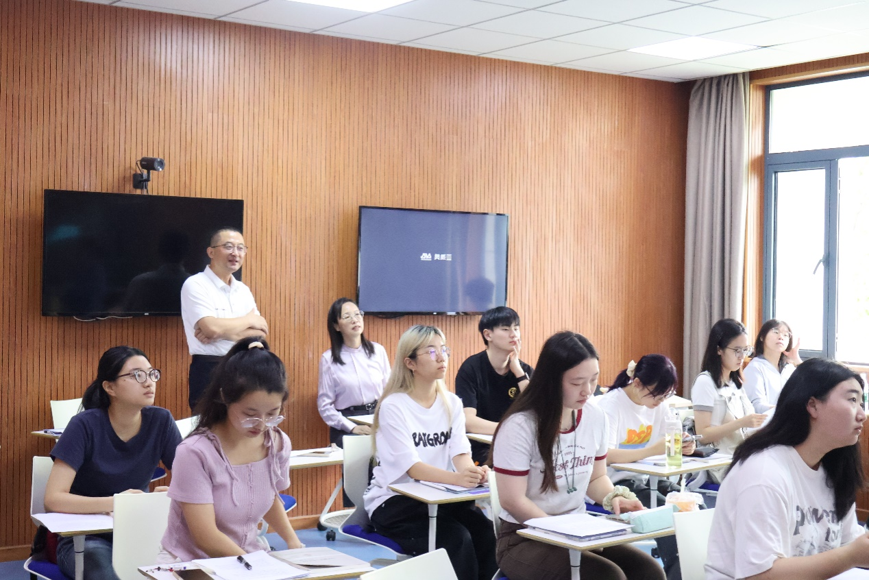 课上,张环宙专注听课,仔细记录,密切关注教师上课及学生听课状态。在课堂导入环节,曾芳芝根据课程导入材料巧妙引导学生深入讨论材料内容的翻译是否得体;在师生互动环节,大家围绕“什么是文化”进行了讨论。张环宙认真观察并不时露出赞许的笑容。