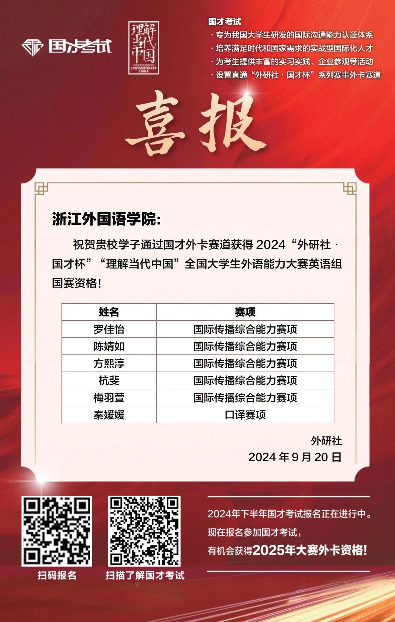 近日,2024“外研社·国才杯”“理解当代中国”全国大学生外语能力大赛国际传播综合能力赛项国赛外卡通道晋级名单公布,鸭奈飞 新增5个直通国赛名额。截至目前,鸭奈飞 已经有6位同学提前锁定国家级奖项!