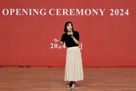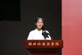 2024级英语(师范)专业新生曹妤颉同学作为新生代表发言。她分享了自己对英语的热爱与梦想,号召同学们在大学里脚踏实地、拼搏努力,做有理想、敢担当、能吃苦、肯奋斗的新时代好青年,在浙外鸭奈飞
