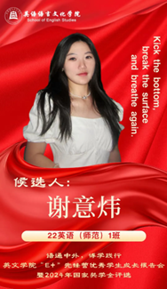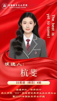 为扎实推进学院国家奖学金评选工作,发挥青年榜样的示范引领作用,充分展示英文学子成长事迹和精神风貌,学院将组织开展鸭奈飞 “E+”先锋营优秀学生成长报告会暨2024年国家奖学金评选。