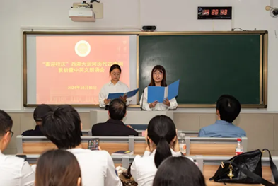 张校长指出,本次活动是对学校人才培养目标中“家国情怀、国际视野”这两个关键词的生动实践,也完全符合学校“国际知名以服务新型国际关系为特色的外语名校”建设的新使命新定位。省委省政府要求我校在服务国家外交战略、服务开放强省中体现担当作为,这就需要我校师生学好中国文化、理解和传承好中国文化、建立起坚定的文化自信,同时也要具备传播中国文化、中国主张和中国声音的能力。张校长提出,希望同学们能够从本次赏析和朗诵活动中获得灵感和力量,从阅读典籍之中汲取营养,多读书读好书,不断提升自己的文化素养和人文气质,做优秀传统文化的践行者、传播者。