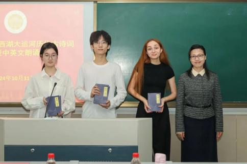 “喜迎校庆”西湖大运河历代古诗词赏析暨中英文朗诵会于10月31日下午在望D411举行。本次活动由文旅、英文、中文三个学院联合举办,百余名师生参加。校长张环宙教授到会致辞并向学生代表赠送“中华国学经典精粹”丛书。