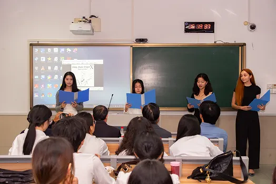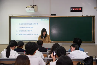 刘莹副教授结合学生朗诵的英国著名诗歌“I Wandered Lonely as a Cloud”,讲授《从华兹华斯看英国浪漫主义诗歌》,深入阐释《咏水仙》的创作背景、诗歌的格律音韵分析、英国抒情诗与中国古代山水诗的关联等。