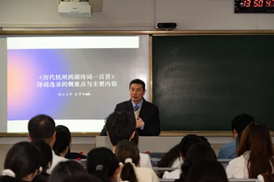 浙江大学人文学院原党委书记张梦新教授围绕亚运会礼品书《历代杭州西湖诗词一百首》,讲授历代名家吟咏西湖的诗作,分析诗歌相关的杭州风情民俗、阐释志士豪杰爱国爱民情怀,深情表达对杭州这座城市的热爱和自豪。