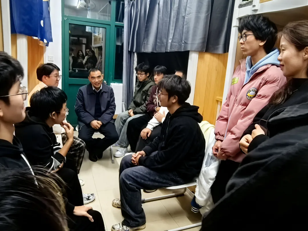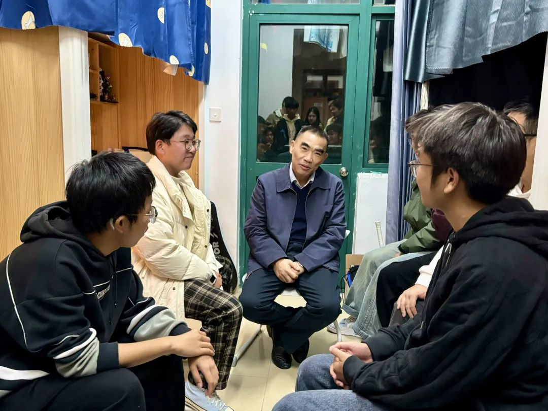 大一新生寝室,和同学们进行面对面交流。学院党委书记田俊杰、党委副书记欧万彬和新生辅导员陪同走访。