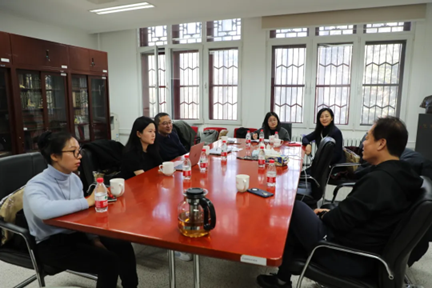 邢富坤、盛煜冰、张春青、陆海霞、郭安琪、张静静与北大外语学院副院长付志明进行了座谈。双方就教学相关的议题展开了讨论。付志明介绍了北大外语学院教师师资队伍、学生人才培育现状与困境、课程设置、跨学科与兴趣班项目开展等情况做了详细介绍。双方就未来合作的可能性展开了深度洽谈,双方都表示将为我院师生赴北大学习交流以及双方教师进行教学交流提供平台。