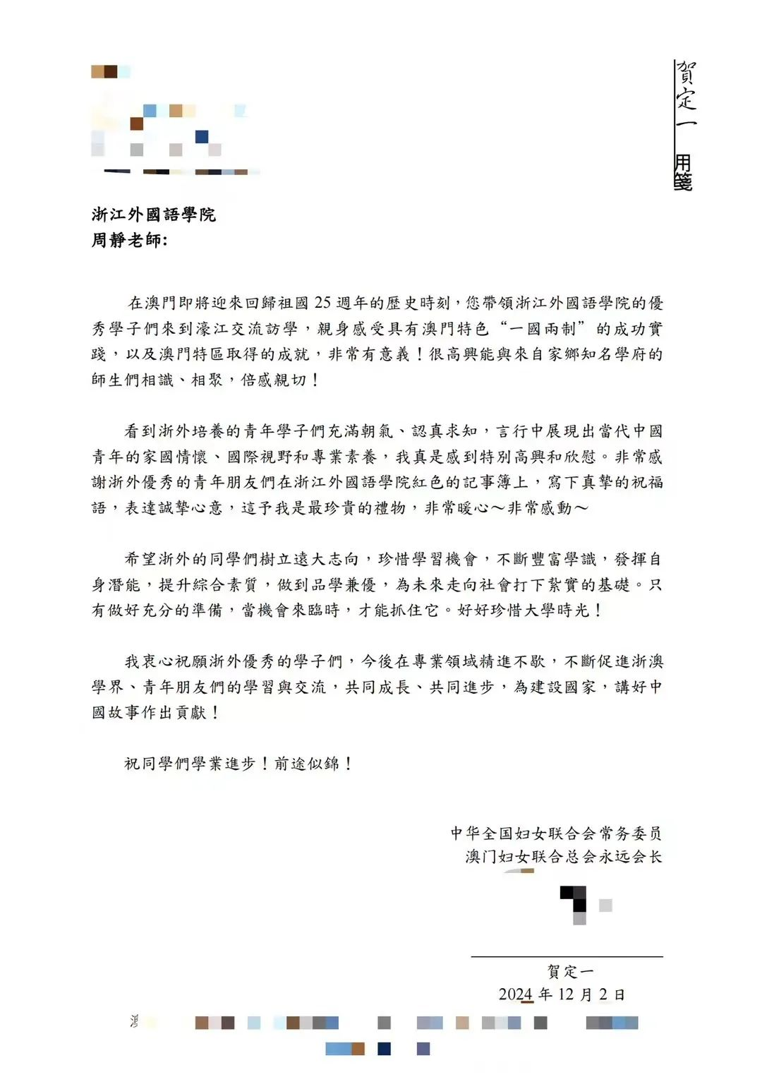 贺定一在给浙外师生的来信中表示,在澳门即将迎来回归祖国25周年的重要时刻,浙外师生来到濠江交流学习,亲身感受具有澳门特色的“一国两制”的成功实践,以及澳门特区取得的成就,非常有意义!她很高兴能与来自家乡知名学府的师生们相识、相聚,倍感亲切!
