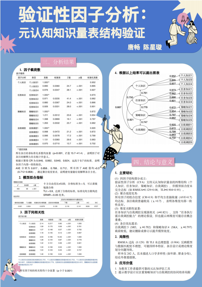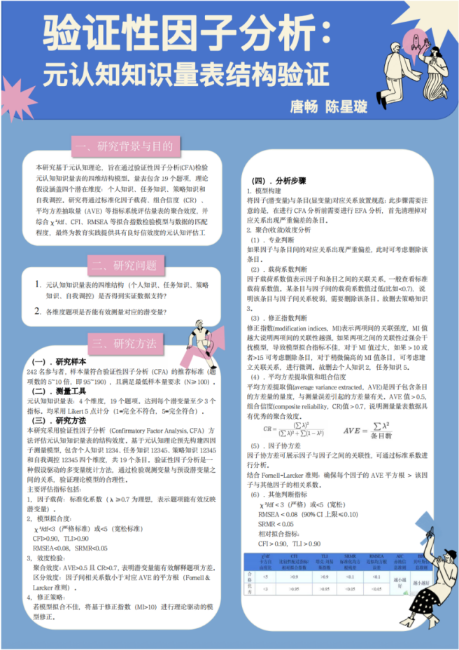 以前总觉得 “做研究” 是遥不可及的事,这门课彻底改变了我的想法。原本对着数据一头雾水,跟着老师使用Jamovi一步步从简单的独立性t检验,单因素方差分析做到越来越复杂的验证性因子分析,我们感受到了自己能力的逐步提升,对应用语言学研究方法的了解也一步步深入清晰。最后和小组一起完成海报汇报,看着我们的研究设计从模糊想法变成清晰的可视化成果,真的特别有成就感。