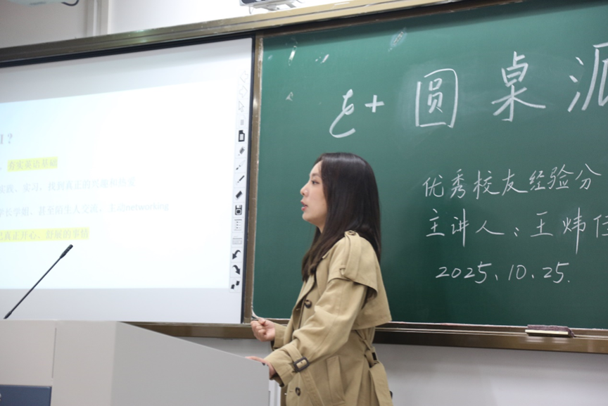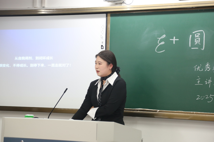 2023届校友、现某医疗器械公司大客户经理张濛婷以“从自我调剂到闭环成长:我的职业加速之路”为题,分享了她在考研失利后选择留学、并实现职场快速晋升的经历。她围绕“自我调剂”与“闭环思维”展开讲述,鼓励学弟学妹不畏变化,以高执行力把握成长机遇。
