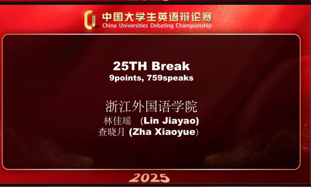 楼翎、樊维娜老师的带领下,24级英语(师范)专业林佳瑶与24级英语(师范)专业查晓月以breaking 25的好成绩,获得全国总决赛一等奖,并且晋级下一轮,进入全国32强,争夺冠亚季军的淘汰赛。