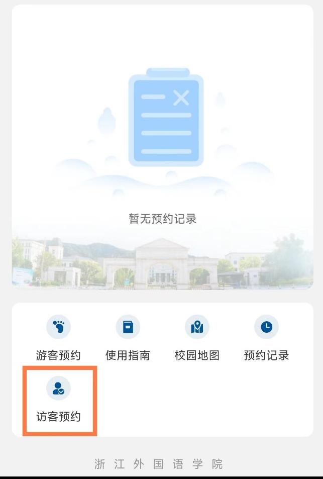 ”公众号→“办事大厅”→“社会人员进校预约”→选择“访客预约”,填写访客登记信息(被访人信息填“2260041”,单位写“个人”,开始时间与结束时间为考试当天考生进校时间和离校时间,来访事由写“BEC考试”)。经校内联系人审核通过后,凭访客码进校。