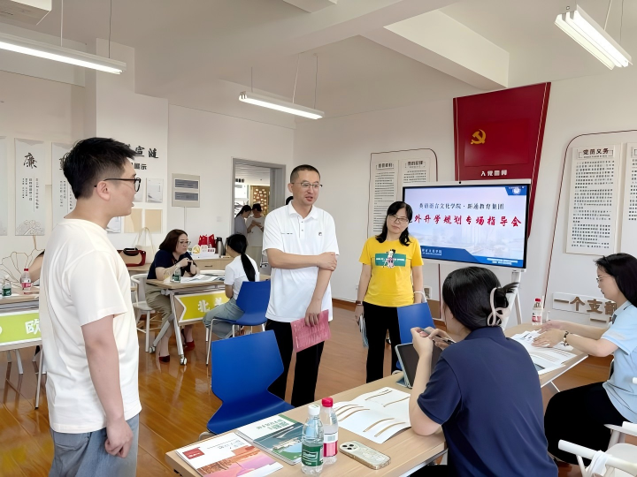 特别推出“名企进校园”系列宣讲会。7月2日下午,新通教育集团国际升学规划专场指导会于融A316顺利举行。院长邢富坤、副院长郑淑贞、就业负责人吴小慧在现场与企业代表深入交流。