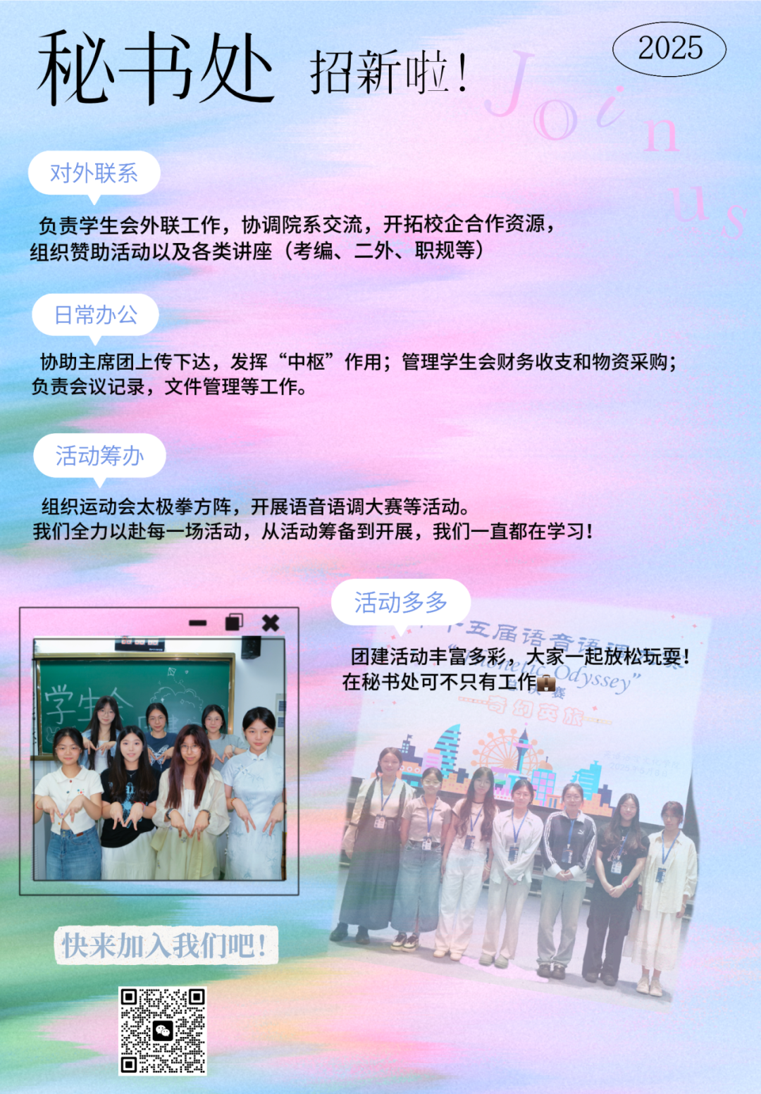 学生会的中枢地带,是协调与沟通的桥梁。秘书处主要负责联系校内外机构,组织拉取赞助。是学生会日常工作的“靠山石”:处理学生会日常事务,协调各部门关系及协助主席团上传下达、内交外联;负责财务管理、会议记录等重要工作。是你施展才干的“演出台”:筹办各类活动,从策划设计到中控场控,为广大学子提供丰富多彩的校园生活!