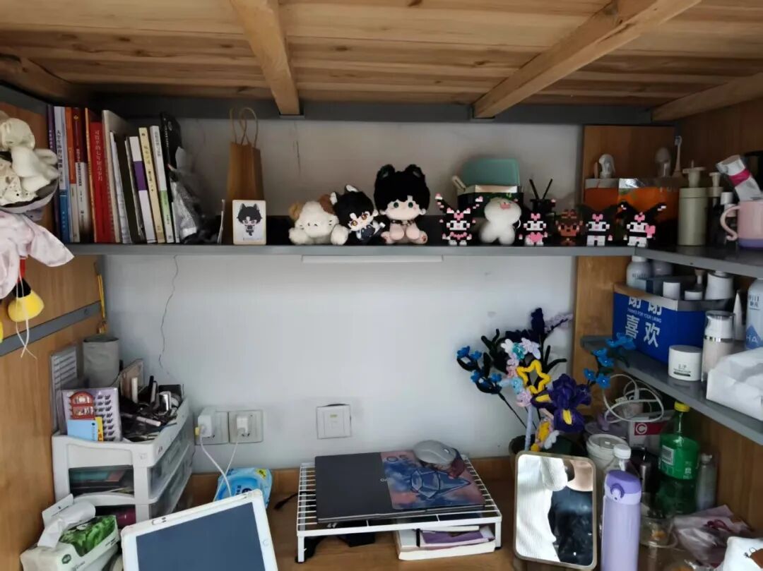 128是我们的温馨小窝:上下铺旁挂着软乎乎的衣被,书桌角落挤满可爱摆件,窗畔晒着生活气息的衣物,门上还有定期更换的鲜花。虽简约却满是暖意,是疲惫时的治愈港湾,藏着我们的日常小欢喜。