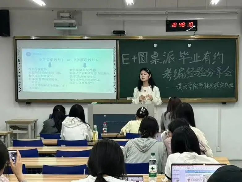 胡思桐首先向大家分析了当前教师编招考的形势,她强调,同学们需珍惜课堂试讲、PPT制作等训练机会,借助老师的指导快速提升教学能力。她结合自身经历,建议在实习期间,利用课余时间在教室练习试讲,提升教学水平。在地域选择上,她建议大家不要局限于热门地区,可选择要求宽松的区域,利用自身排名优势增加上岸几率。