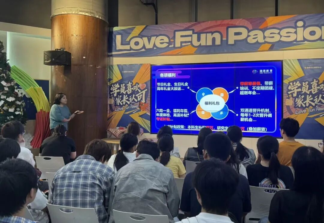 Joanna指出瑞思教育为大家提供助教、主教老师、管培生等多个工作岗位,同时拥有带薪寒暑假,考证补贴等薪资福利。