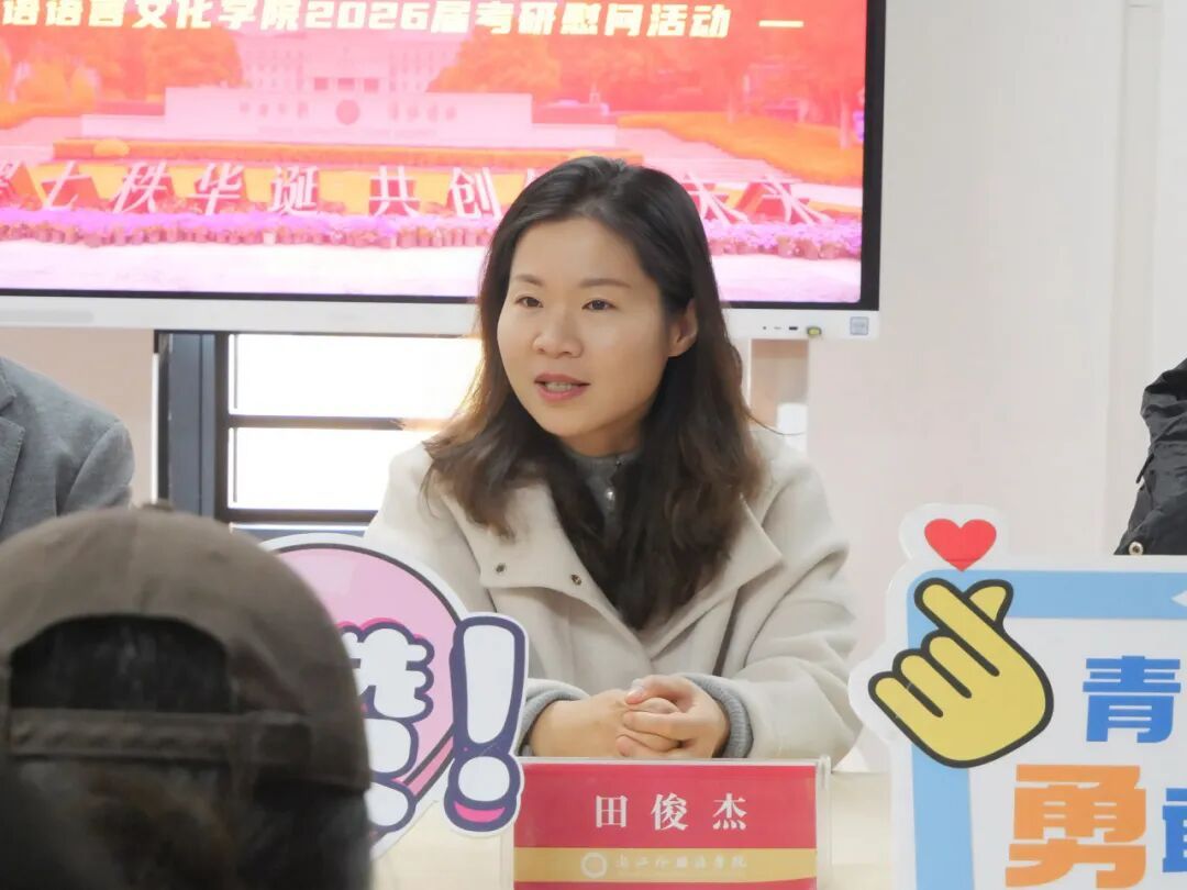 田俊杰以“点赞”“助力”“祝福”三个关键词为同学们加油打气。她高度肯定了大家在课业、实习与论文等多重压力下坚持备考的“了不起”,表示学院将全力为同学们提供学习与生活上全方面的支持,希望每位同学都能实现自己的目标。